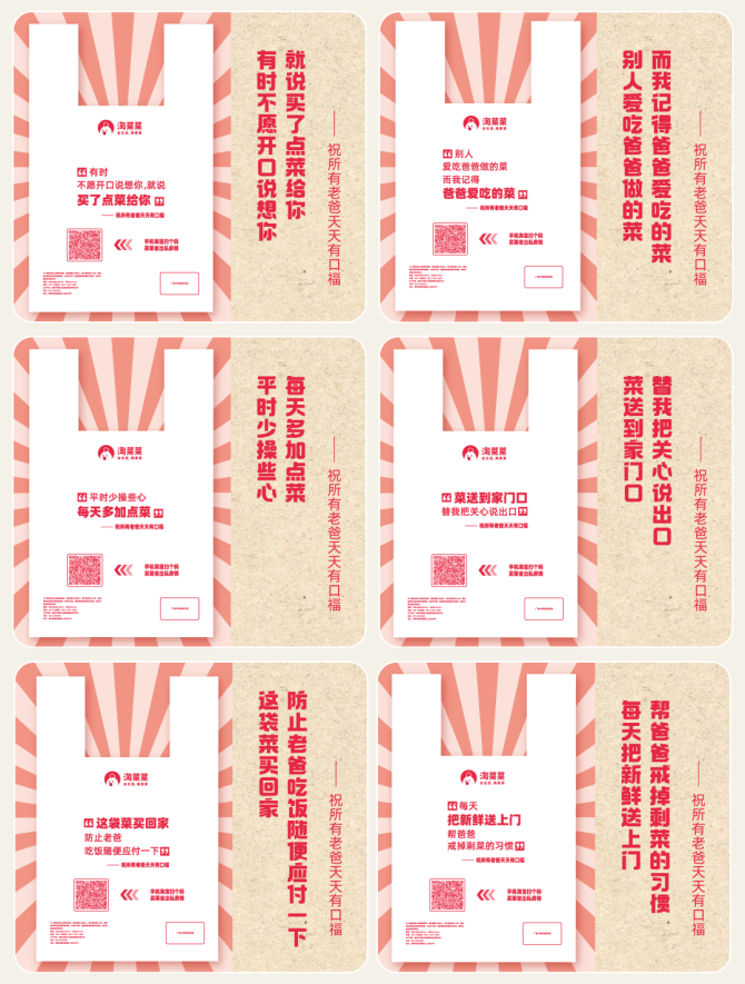 消費(fèi)者除了物質(zhì)需求,還有情感需求。刺激打動(dòng)消費(fèi)者的情感,也能夠驅(qū)動(dòng)購(gòu)買(mǎi)。而價(jià)值共鳴是提煉賣(mài)點(diǎn)最高級(jí)的用法,是情感需求的升級(jí)版。價(jià)值共鳴能夠聚集一批消費(fèi)者,共同為某個(gè)價(jià)值點(diǎn)努力。而你的產(chǎn)品借助價(jià)值點(diǎn)能夠獲得這群消費(fèi)者喜愛(ài)。例如父親節(jié)期間,淘菜菜推出了百萬(wàn)個(gè)帶有花式文案的創(chuàng)意塑料袋到各地團(tuán)點(diǎn)。通過(guò)這些文案的輸出,用戶(hù)買(mǎi)的不再僅僅是菜了,更是一份對(duì)家庭、對(duì)父親的愛(ài)。